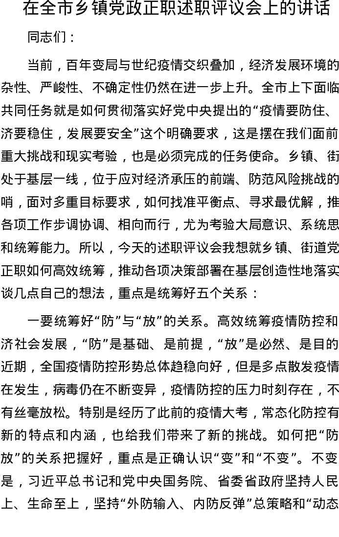 20220922在全市乡镇党政正职述职评议会上的讲话