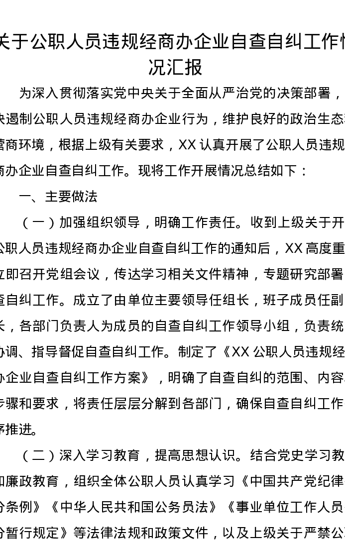 关于公职人员违规经商办企业自查自纠工作情况汇报
