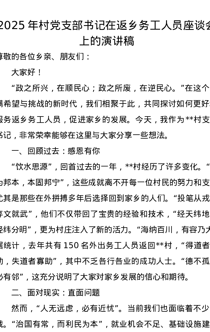 2025年村党支部书记在返乡务工人员座谈会上的演讲稿