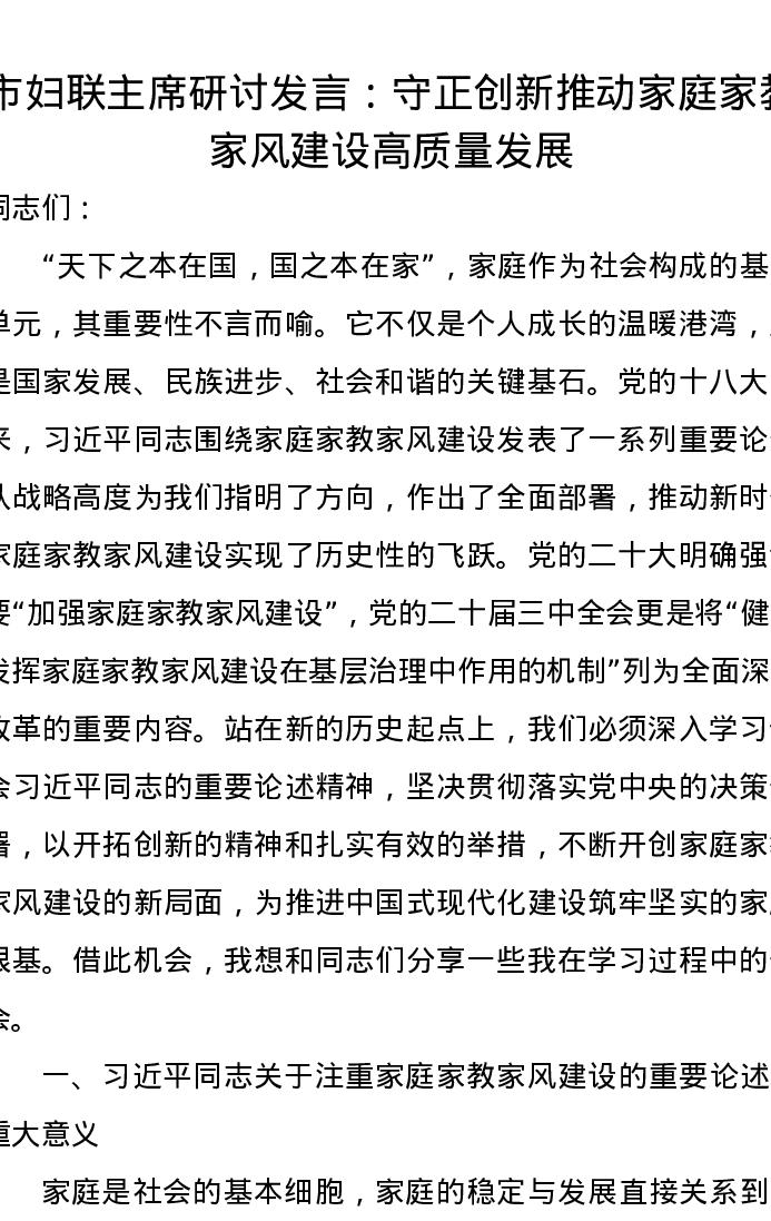 市妇联主席研讨发言:守正创新 推动家庭家教家风建设高质量发展