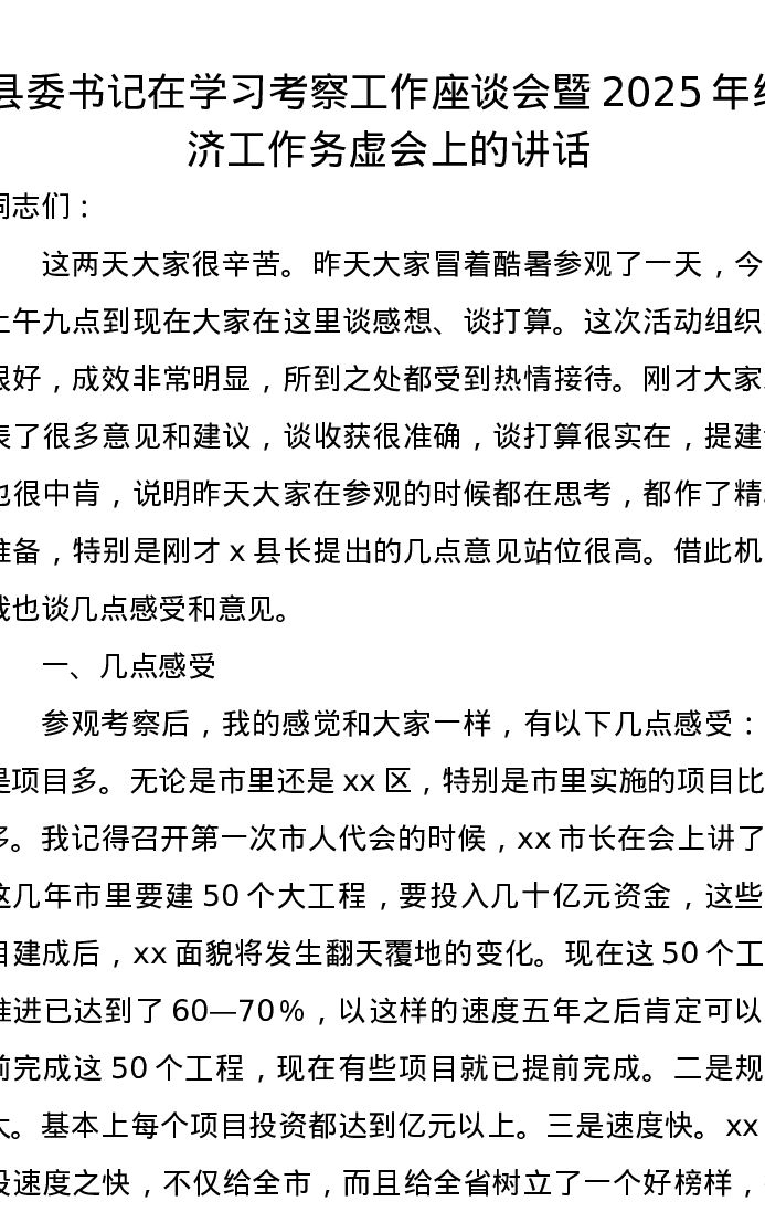 县委书记在学习考察工作座谈会暨2025年经济工作务虚会上的讲话