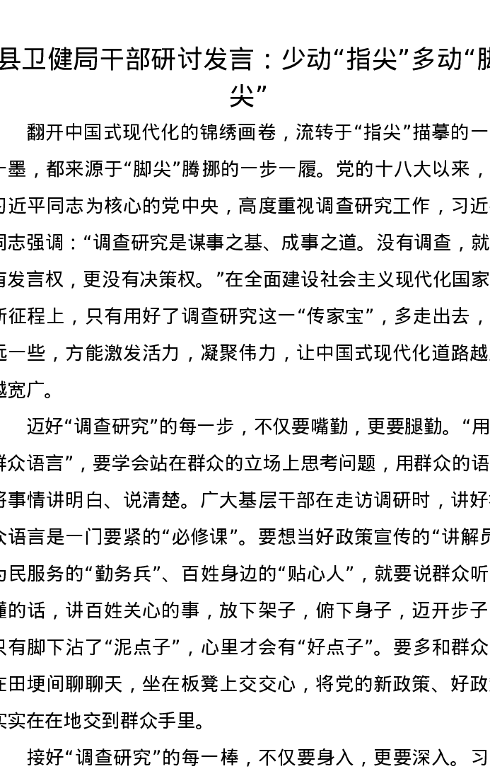 县卫健局干部研讨发言:少动“指尖”多动“脚尖”