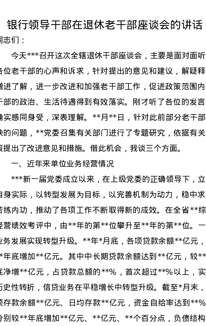 银行领导干部在退休老干部座谈会的讲话