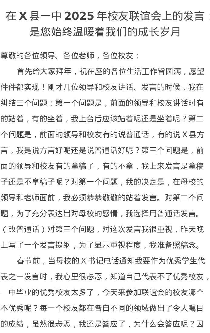 在X县一中2025年校友联谊会上的发言:是您始终温暖着我们的成长岁月