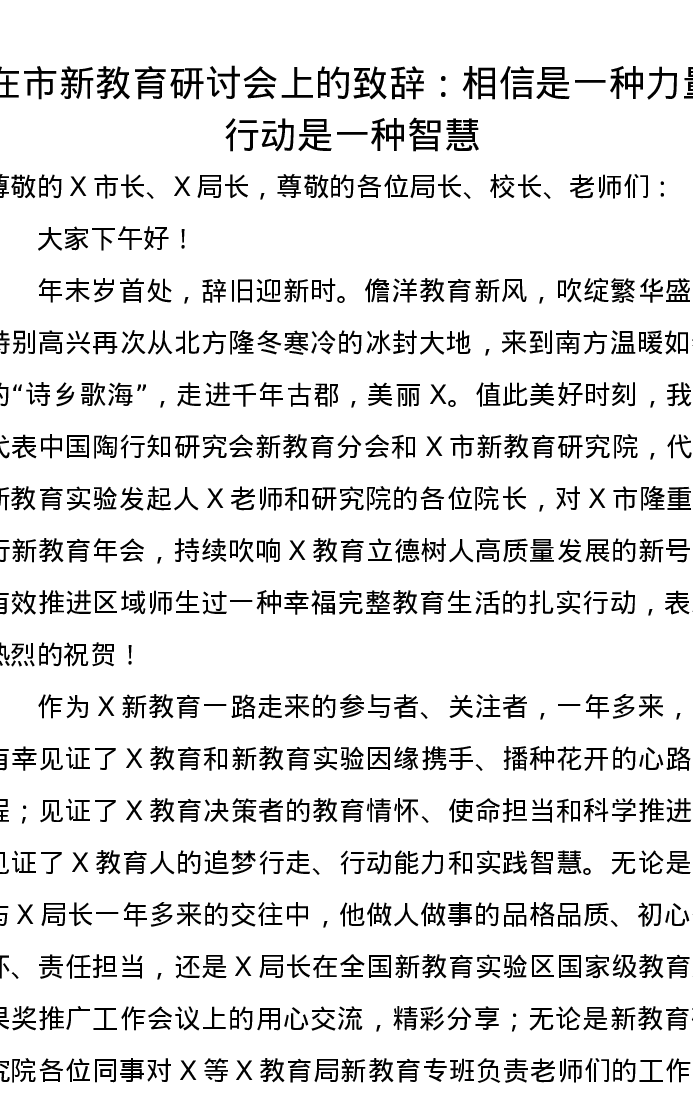 在市新教育研讨会上的致辞:相信是一种力量,行动是一种智慧