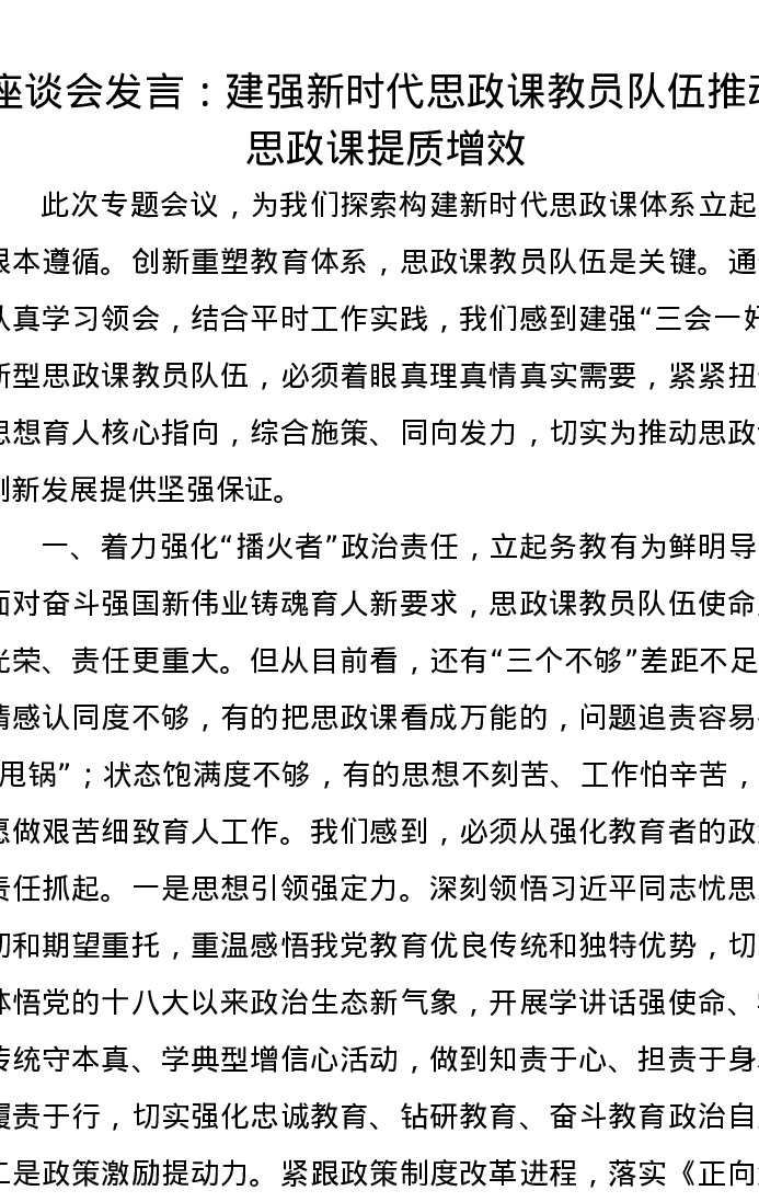 座谈会发言:建强新时代思政课教员队伍推动思政课提质增效