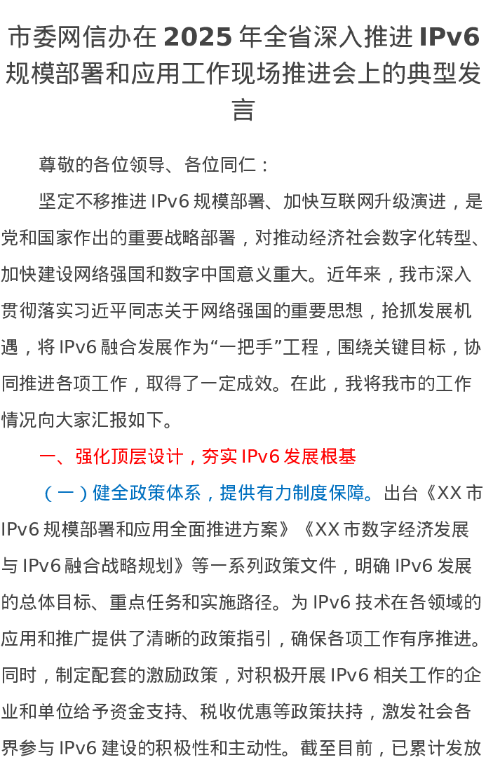 市委网信办在2025年全省深入推进IPv6规模部署和应用工作现场推进会上的典型发言