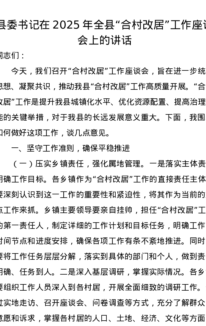 县委书记在2025年全县“合村改居”工作座谈会上的讲话
