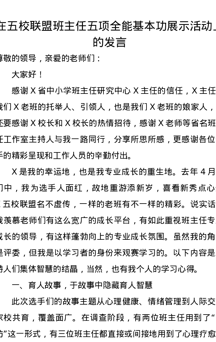 在五校联盟班主任五项全能基本功展示活动上的发言