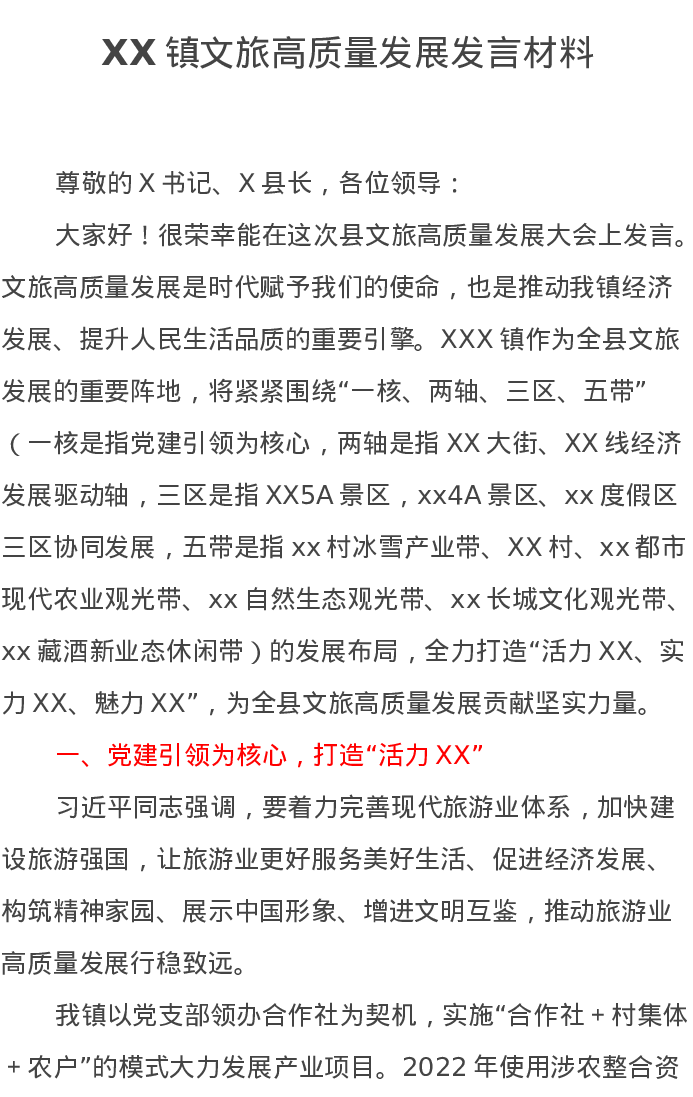 XX镇文旅高质量发展发言材料