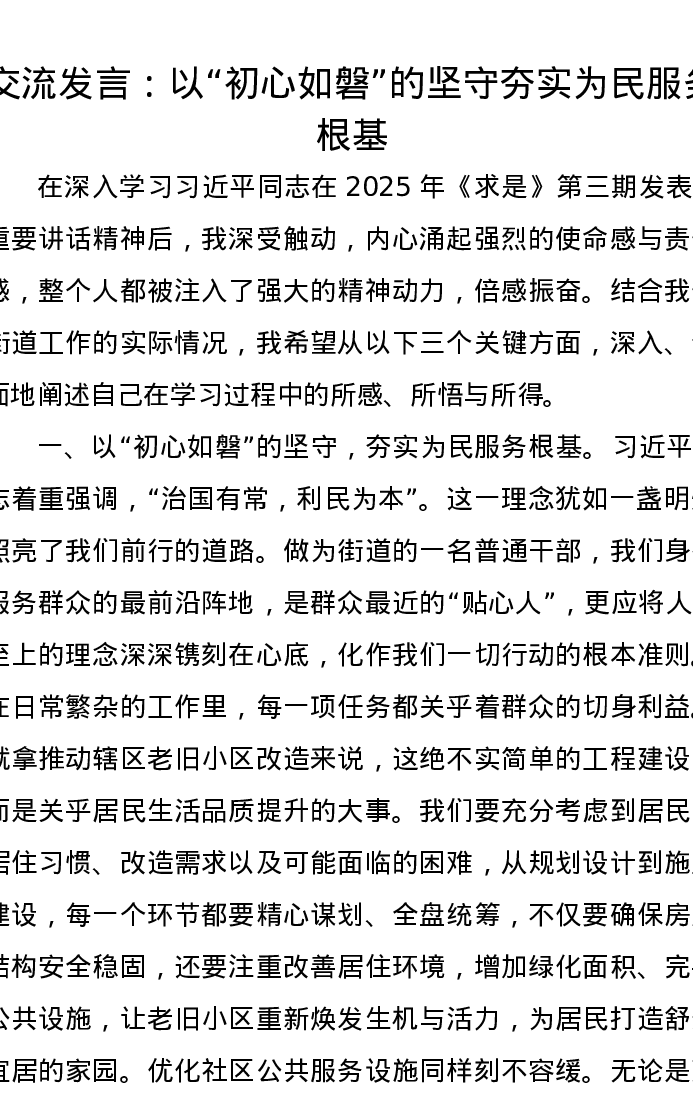 交流发言:以“初心如磐”的坚守 夯实为民服务根基