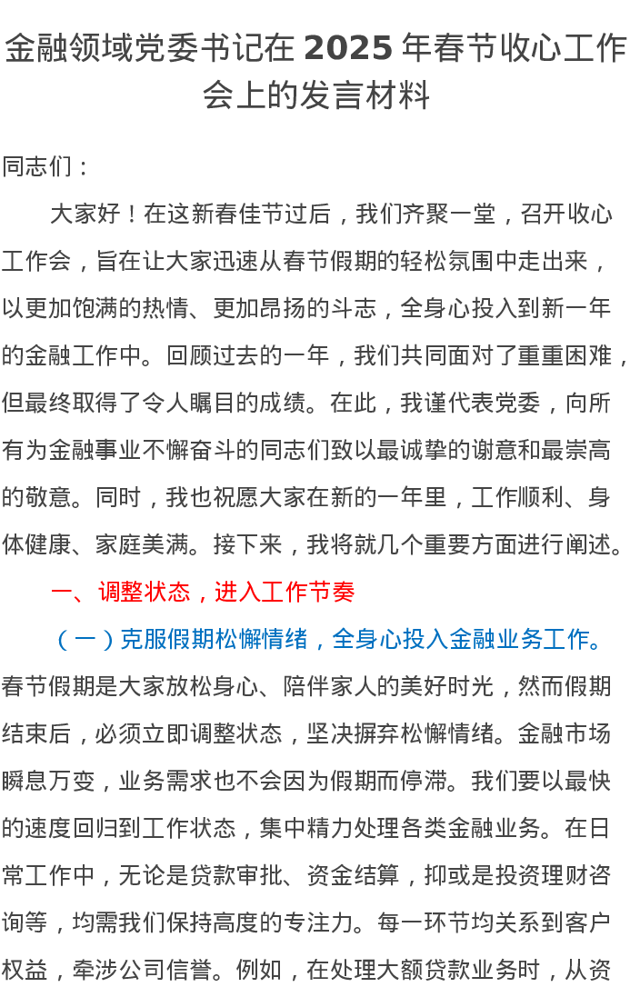 金融领域党委书记在2025年春节收心工作会上的发言材料