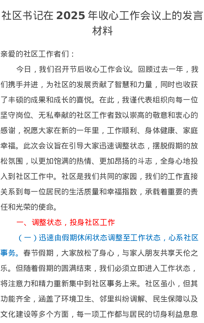 社区书记在2025年收心工作会议上的发言材料