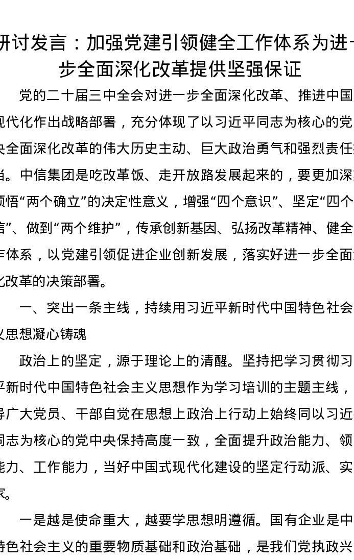 研讨发言:加强党建引领健全工作体系为进一步全面深化改革提供坚强保证