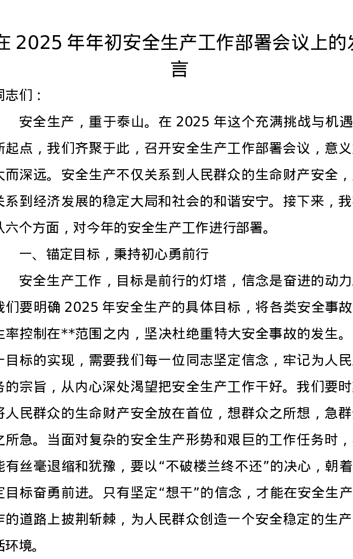 在2025年年初安全生产工作部署会议上的发言