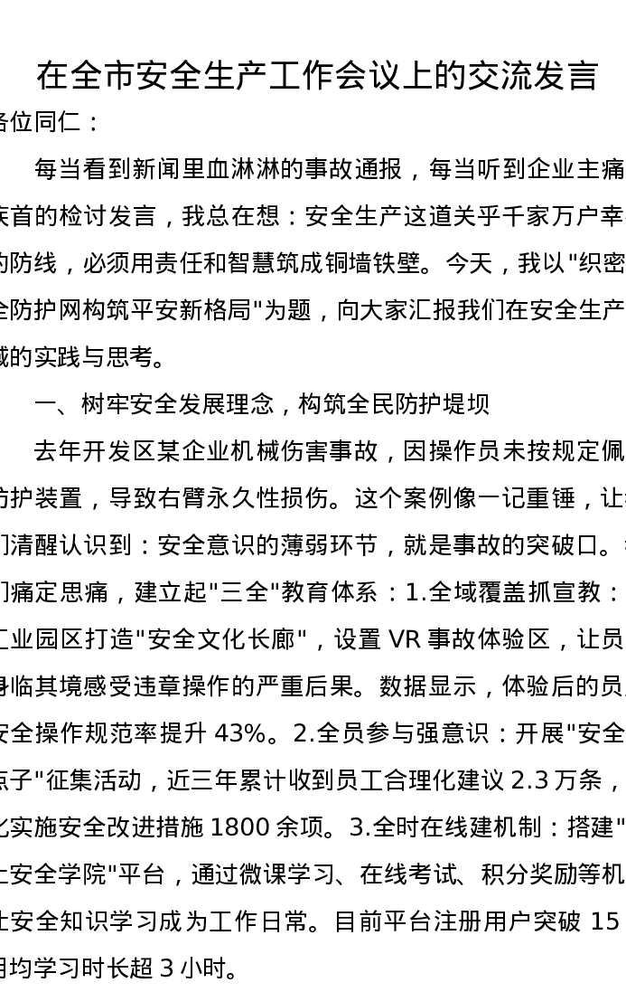 在全市安全生产工作会议上的交流发言