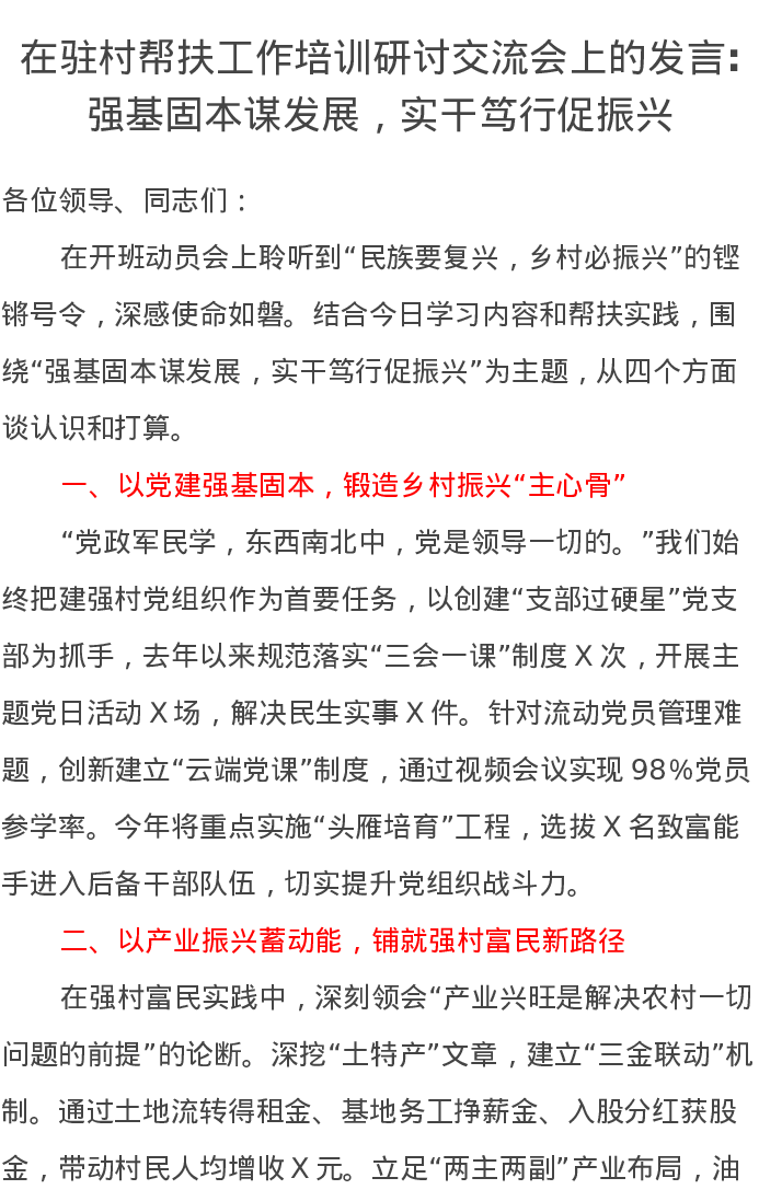 在驻村帮扶工作培训研讨交流会上的发言强基固本谋发展,实干笃行促振兴