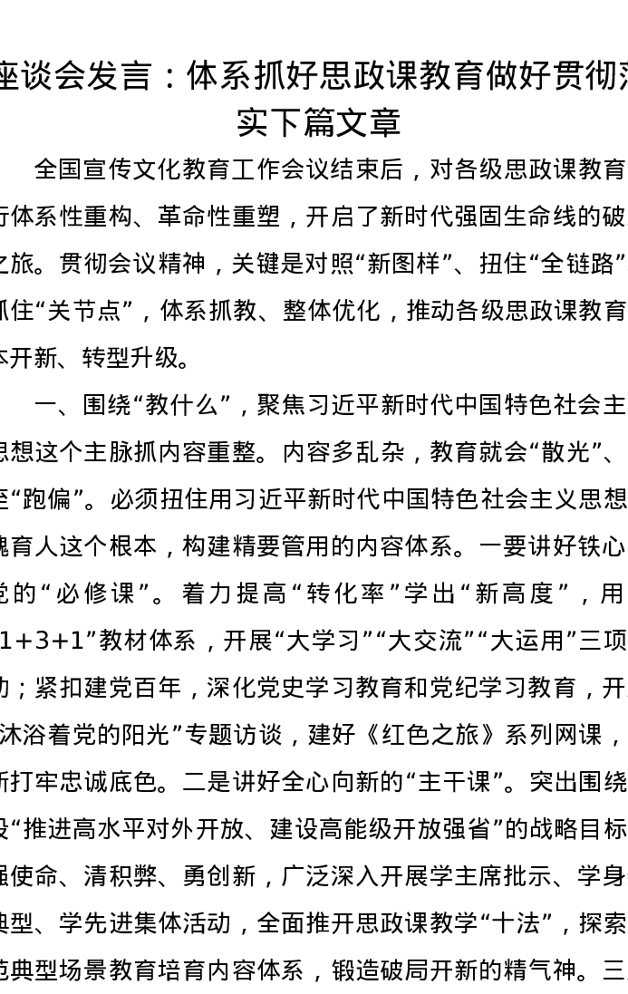 座谈会发言:体系抓好思政课教育做好贯彻落实下篇文章