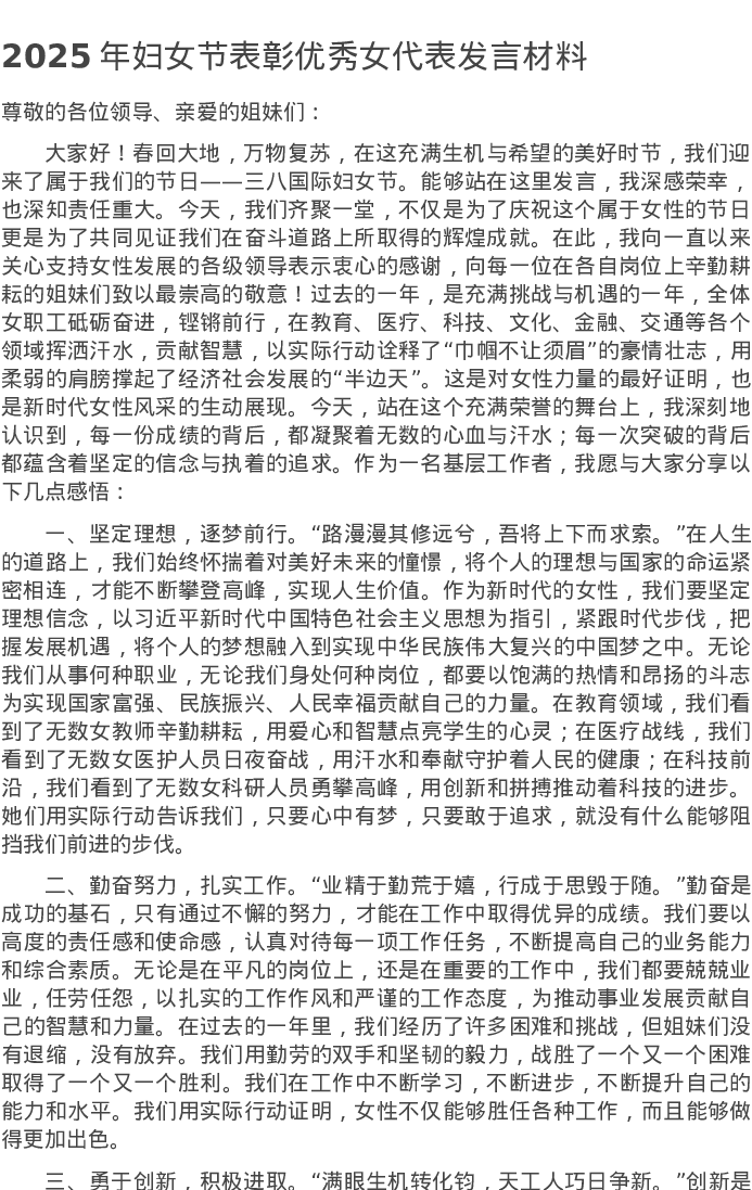 2025年妇女节表彰优秀女代表发言材料
