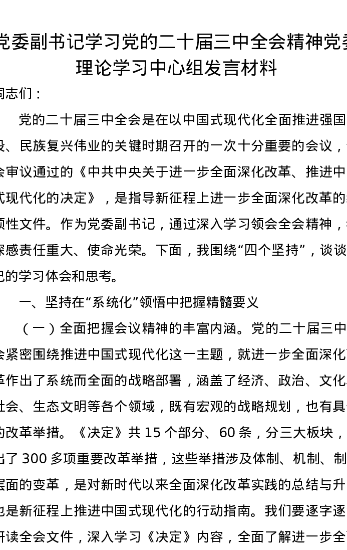 党委副书记学习党的二十届三中全会精神党委理论学习中心组发言材料