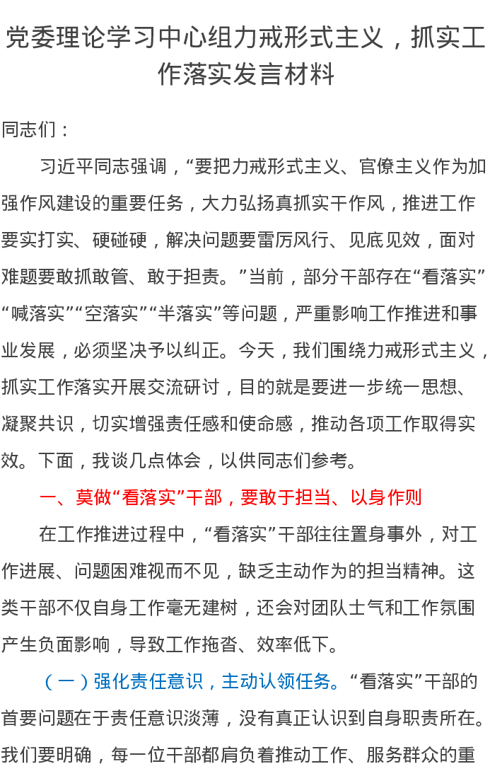 党委理论学习中心组力戒形式主义,抓实工作落实发言材料
