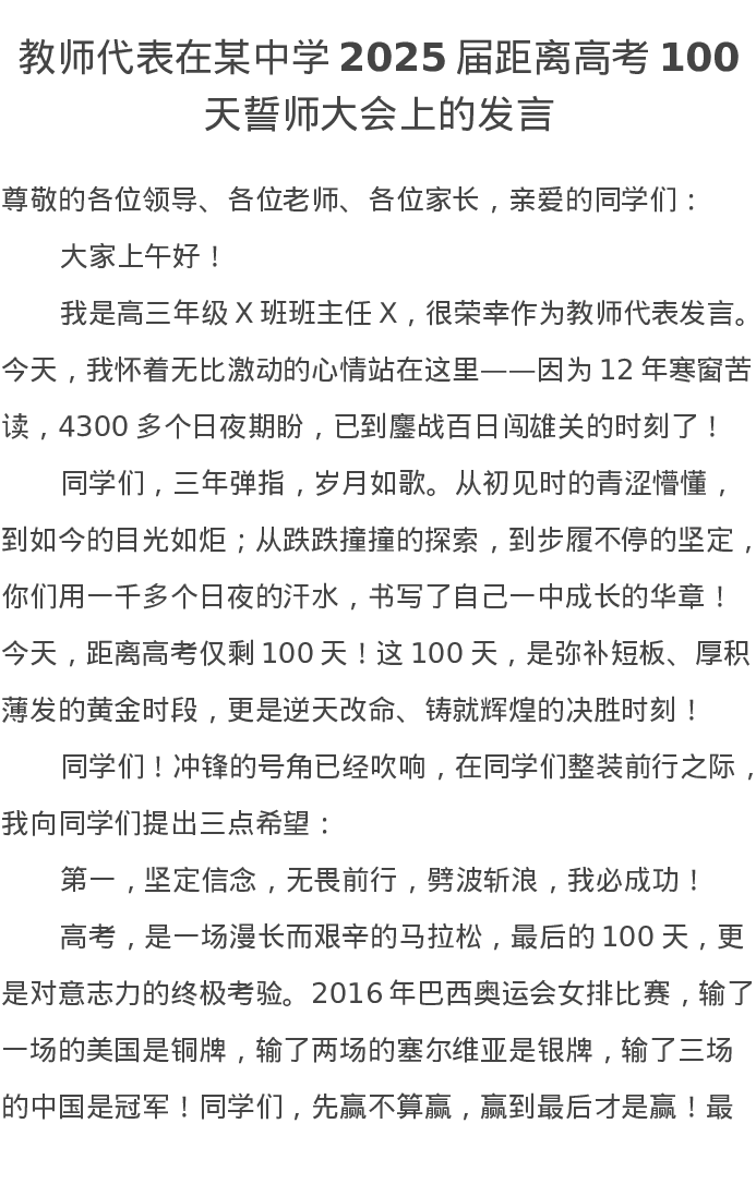 教师代表在某中学2025届距离高考100天誓师大会上的发言