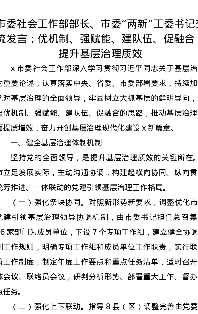 市委社会工作部部长、市委“两新”工委书记交流发言:优机制、强赋能、建队伍、促融合,提升基层治理质效