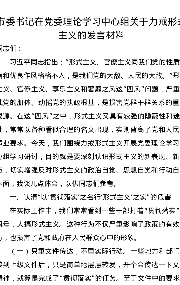 市委书记在党委理论学习中心组关于力戒形式主义的发言材料